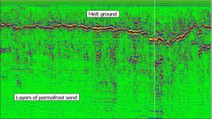 古代河床剖面圖,在現代剖面圖上看不透。河床信號位於剖面的左側部分。在剖面的上部可以看到來自各種岩性邊界的信號。探測頻率:300 MHz。位置區域:立陶宛什文托伊鎮附近。您能找到的所有詳細資訊 ...